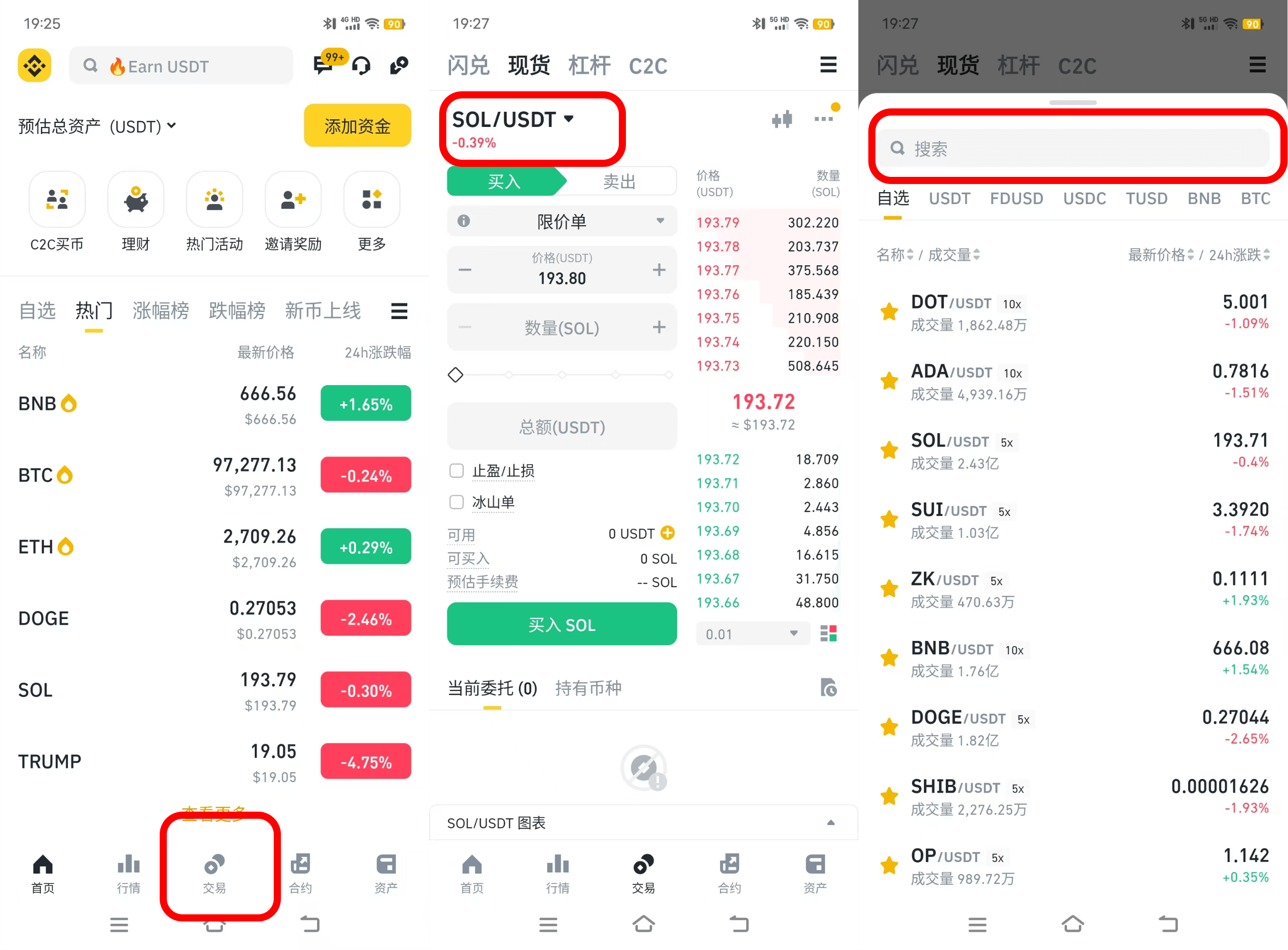 - 登录币安后,点击页面上的【交易】按钮,进入现货交易页面。