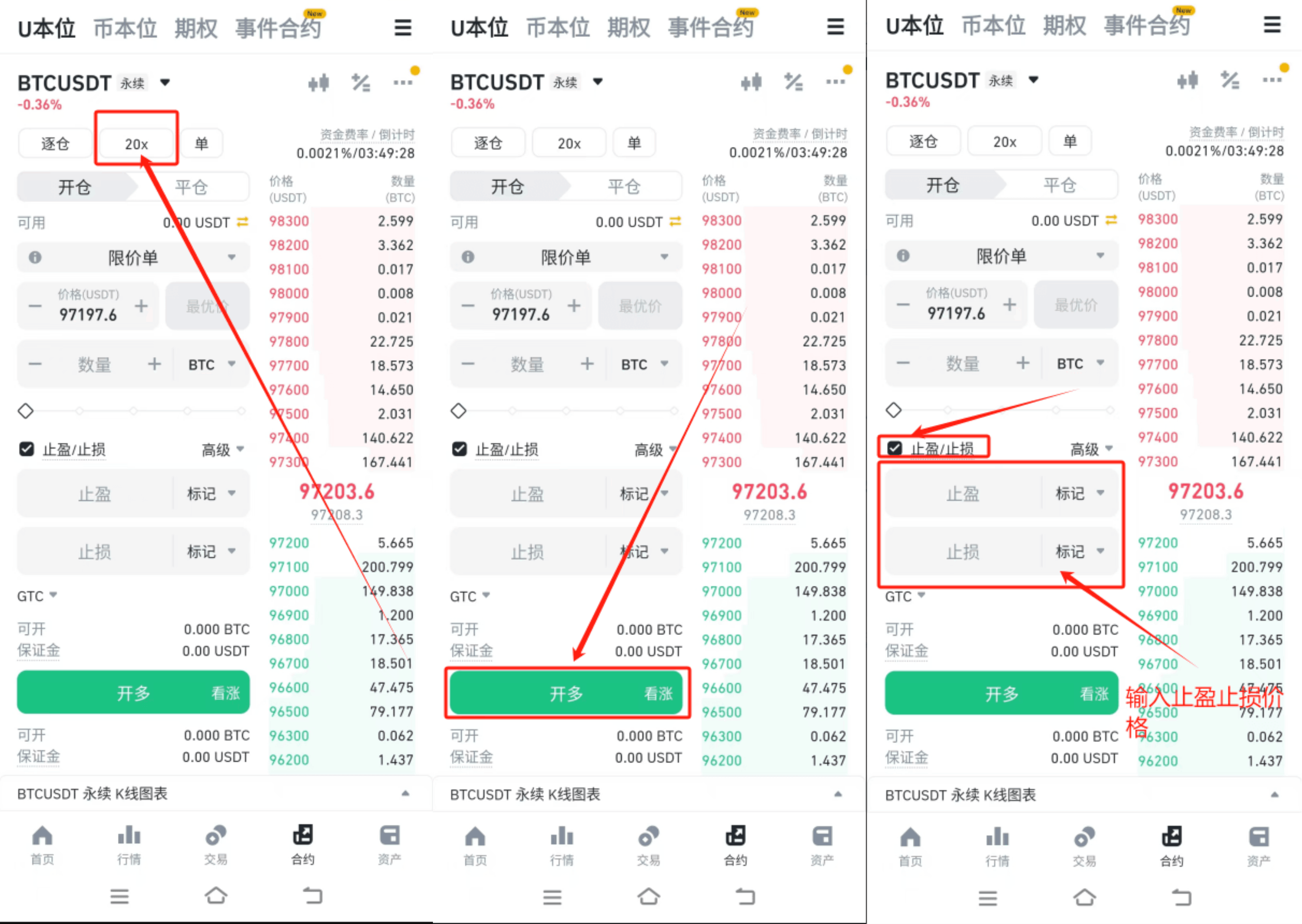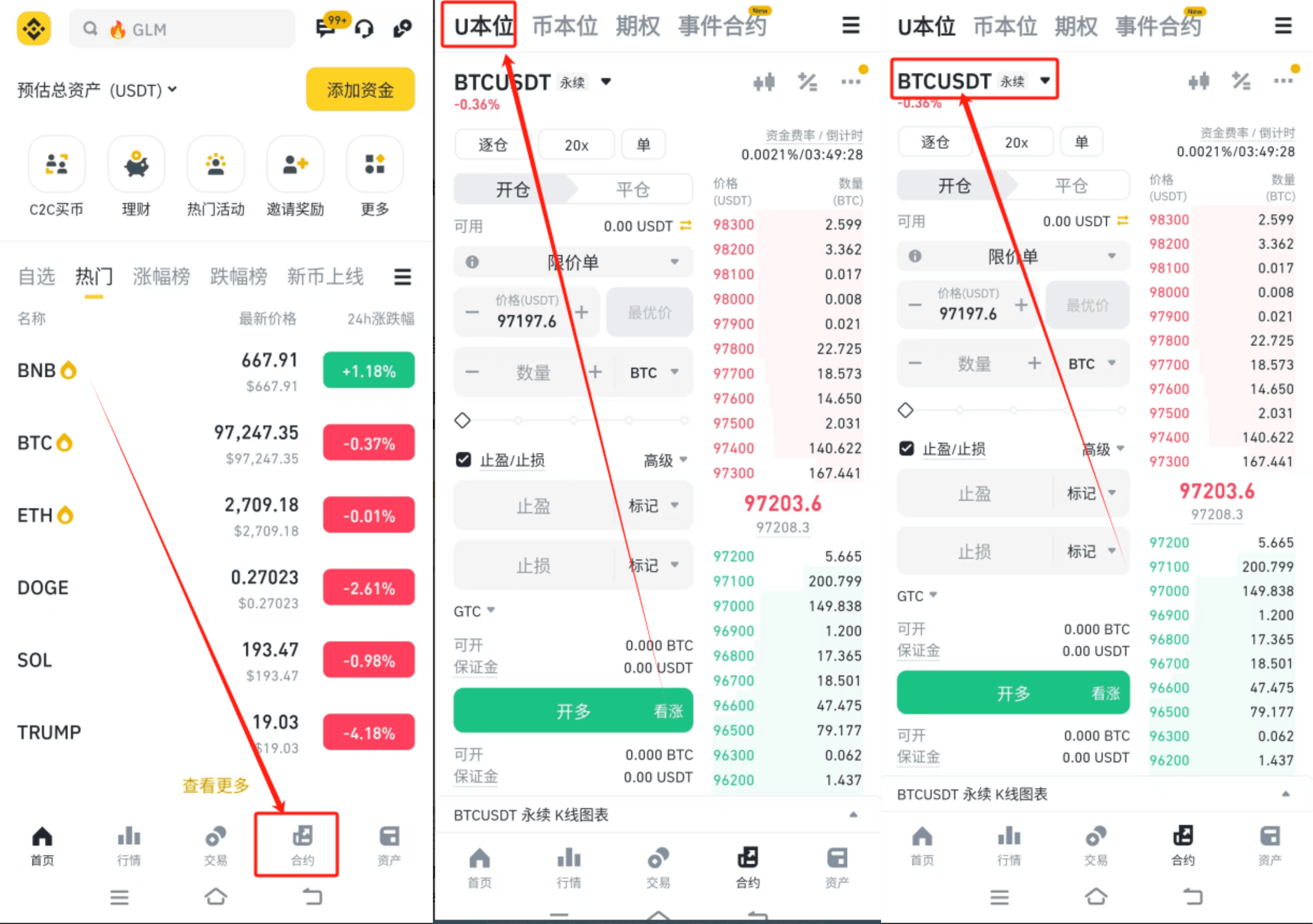 - 步骤1:进入合约交易页面,我们以U本位合约演示