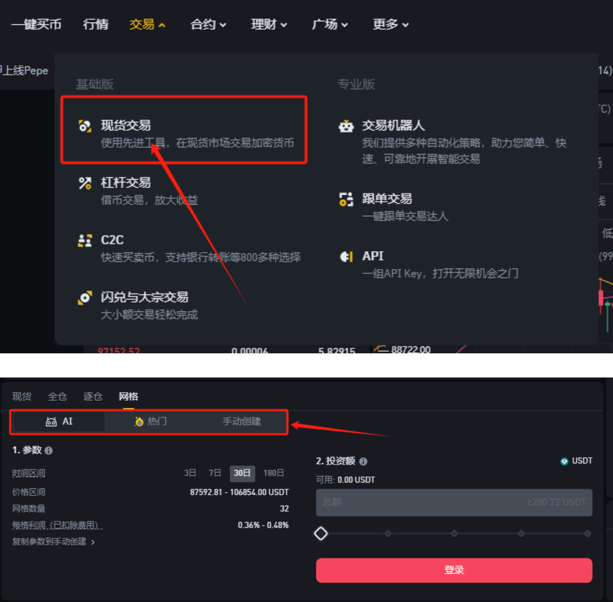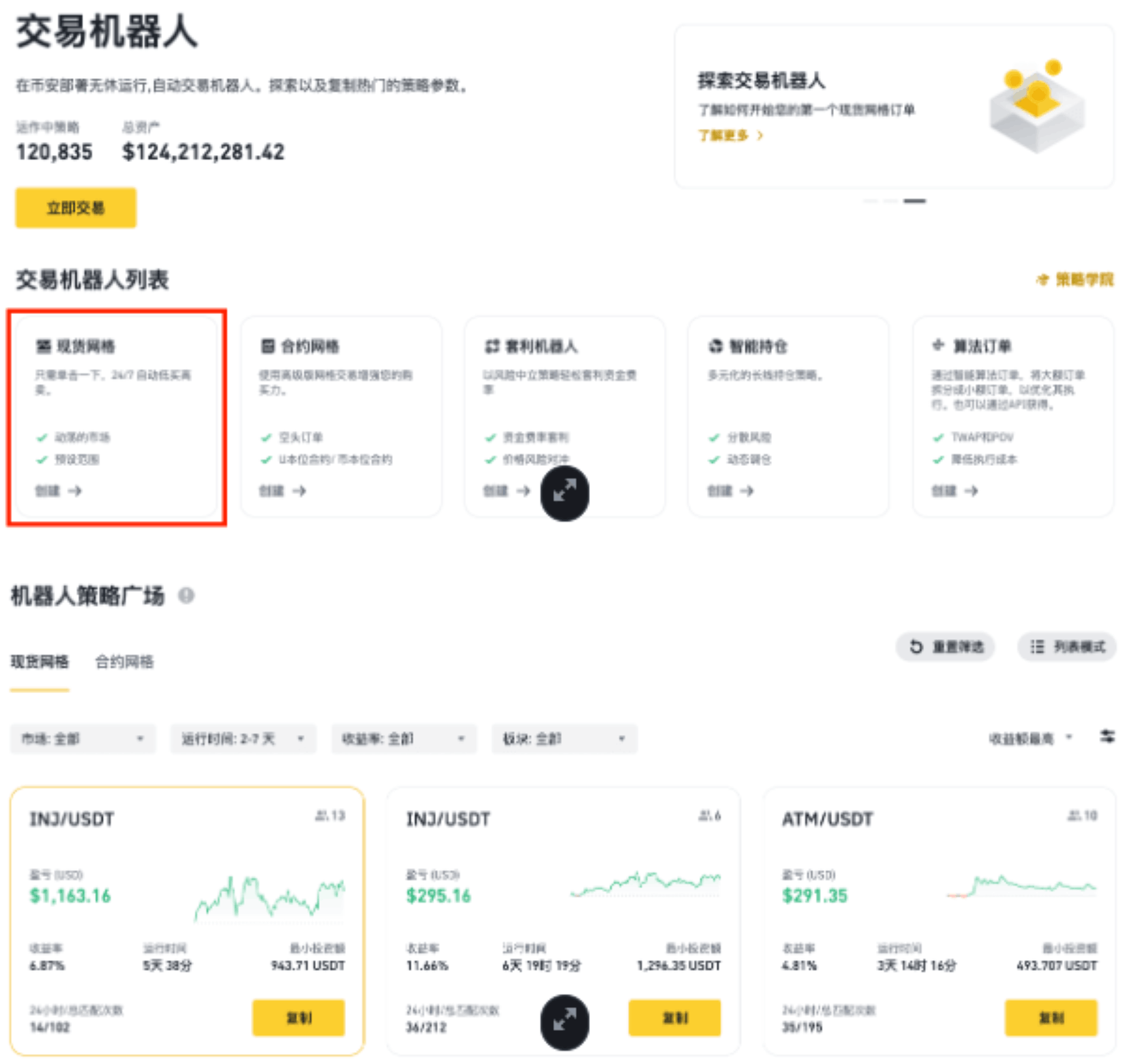 - 您可以点击【现货网格】创建自己的网格交易策略,也可以从【机器人策略广场】复制现有网格策略的参数。