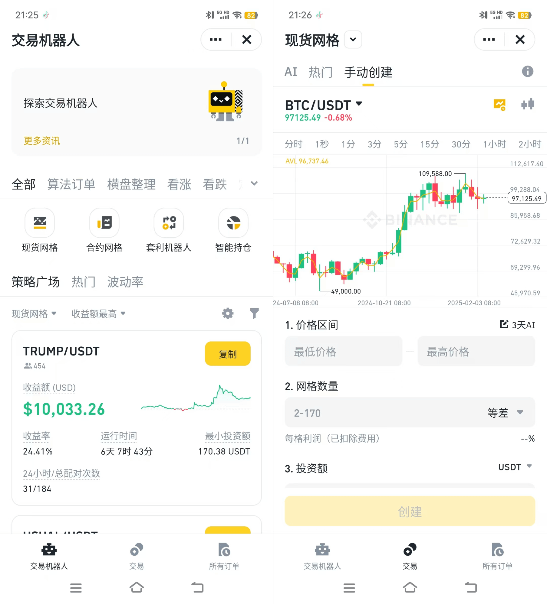 - 若您使用的是币安App,可以通过【交易】 - 右上角三条杠-【交易机器人】 - 【现货网格】访问。