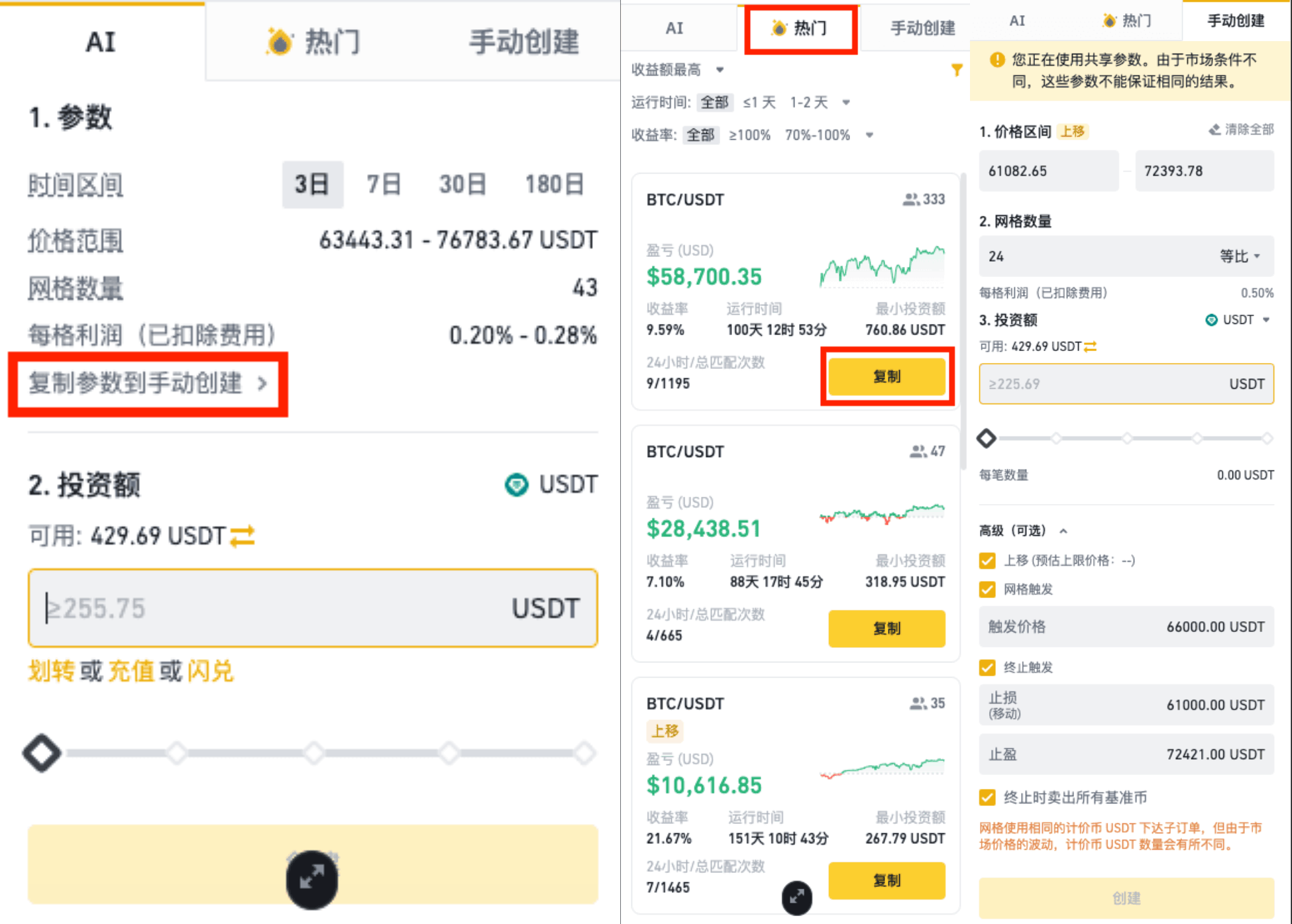 - 点击【AI】选项,我们的系统会根据交易对价格的技术分析和您选择的时间段自动生成参数。 如果要调整参数,也可以单击【复制参数到手动创建】。