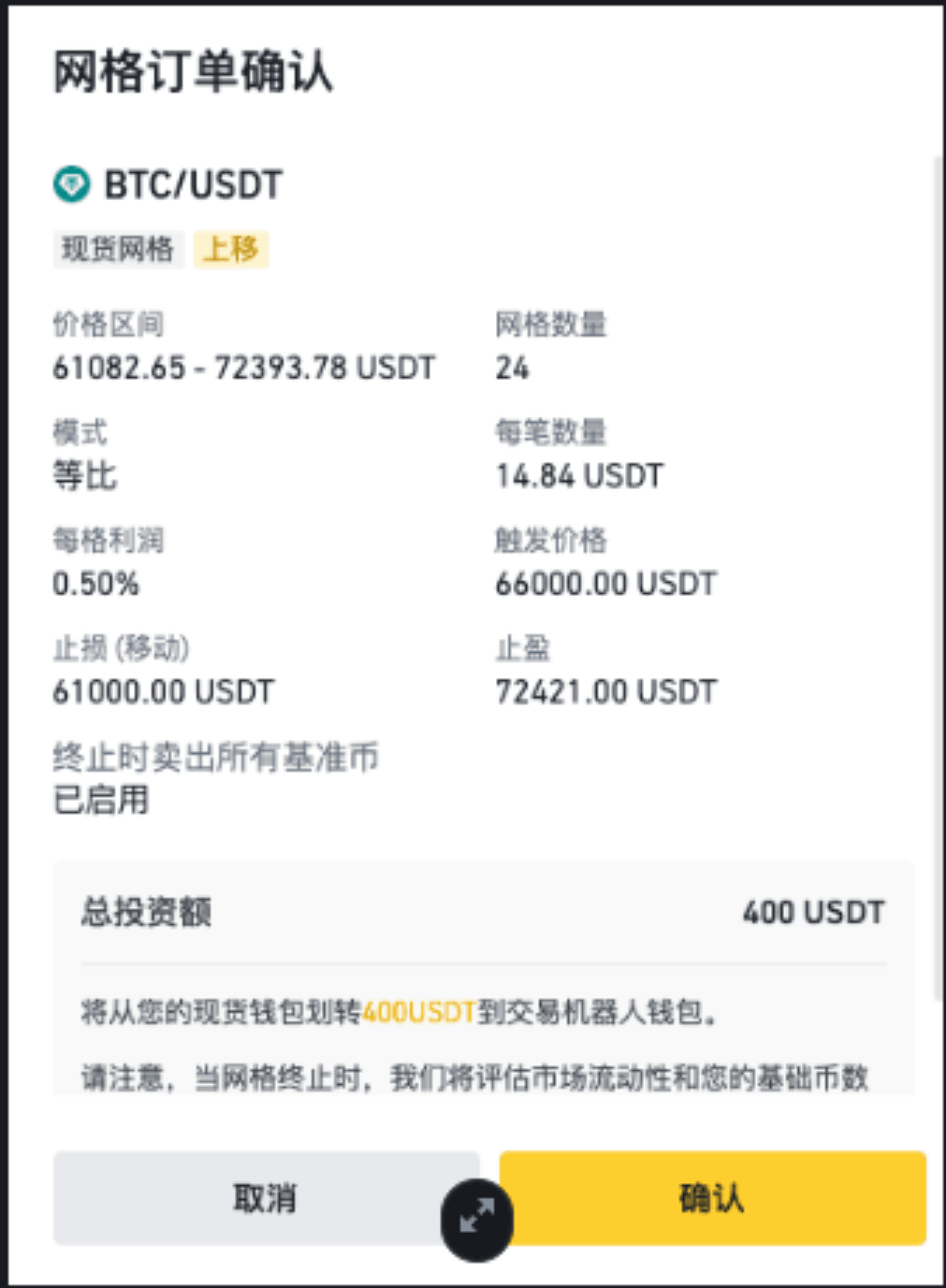 - 用户应理解、确认并接受相关风险。点击复选框,然后点击【确认】,下达现货网格订单