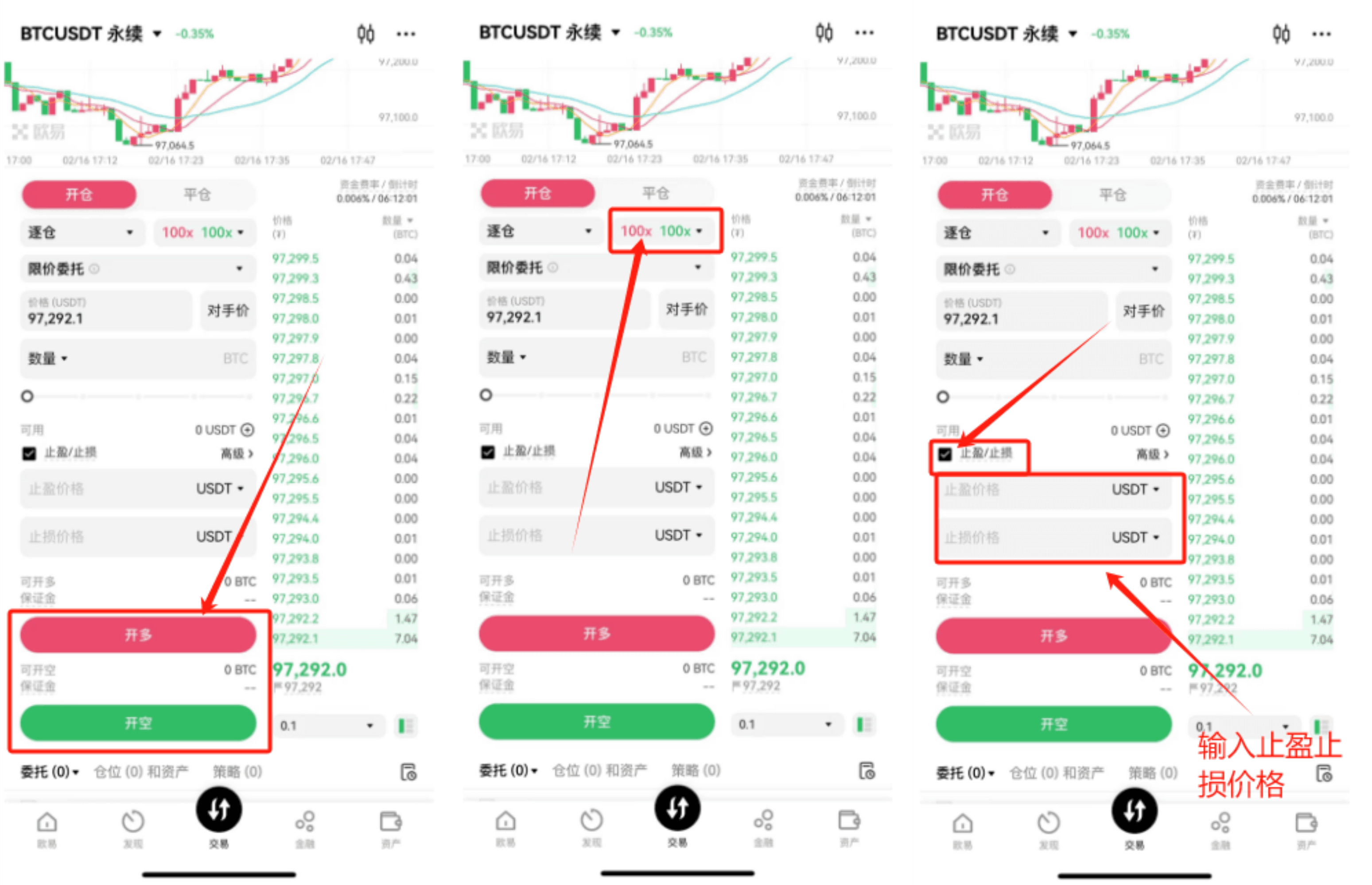- 根据你对市场的判断,选择做多(买入)或做空(卖出)。输入合约的数量和杠杆倍数,点击【开仓】。