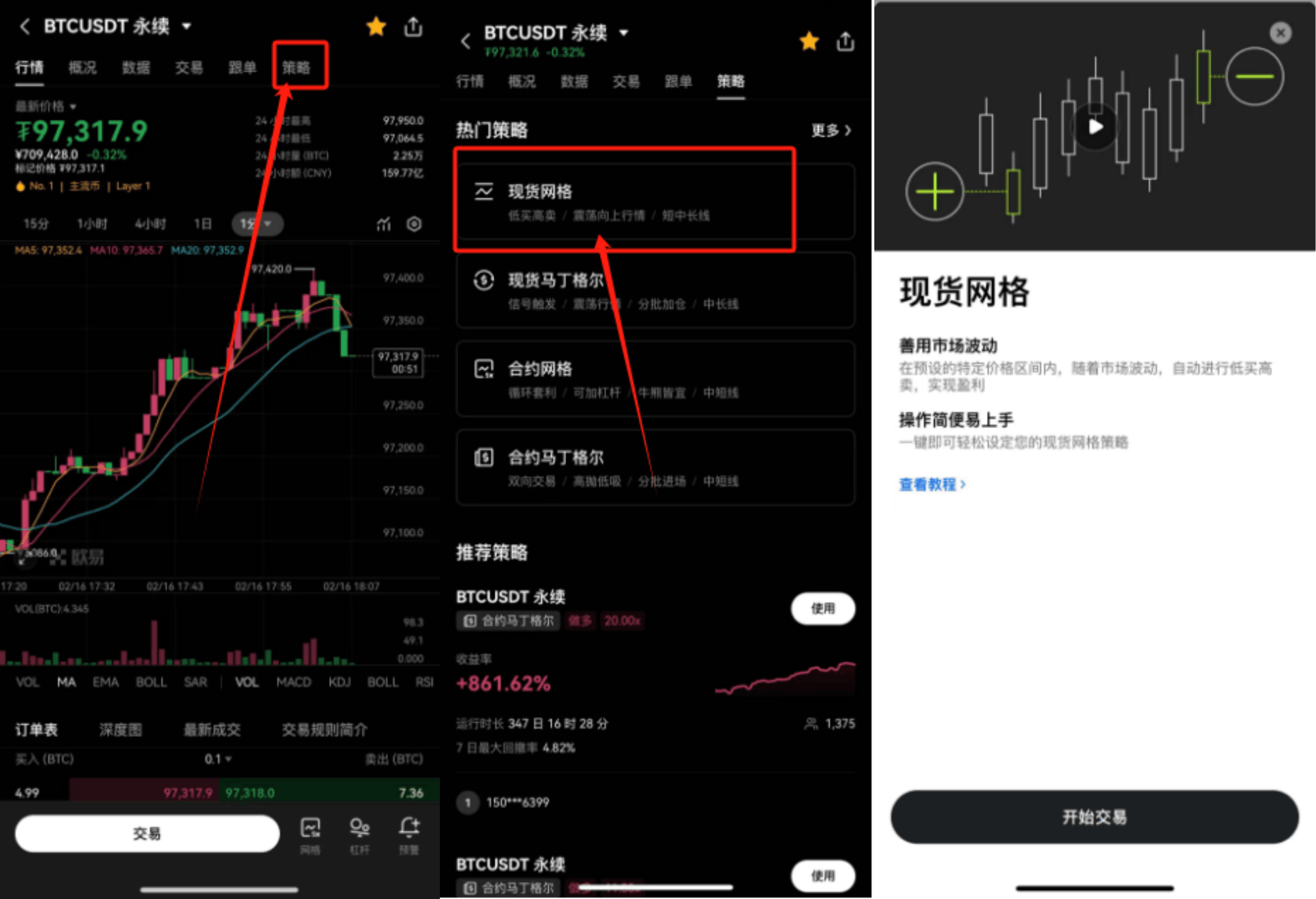 - (1)进入OKx的PC端或APP端之后,在"交易"页面中选择"策略交易模式"(PC端在左上角,APP端在右上角),然后选中现货网格。