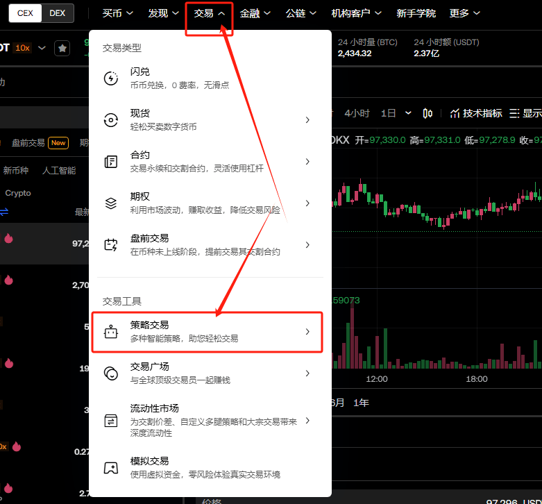 - 登录OKX后,点击页面上的【交易】按钮,进入现货交易页面。