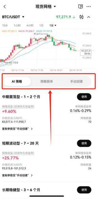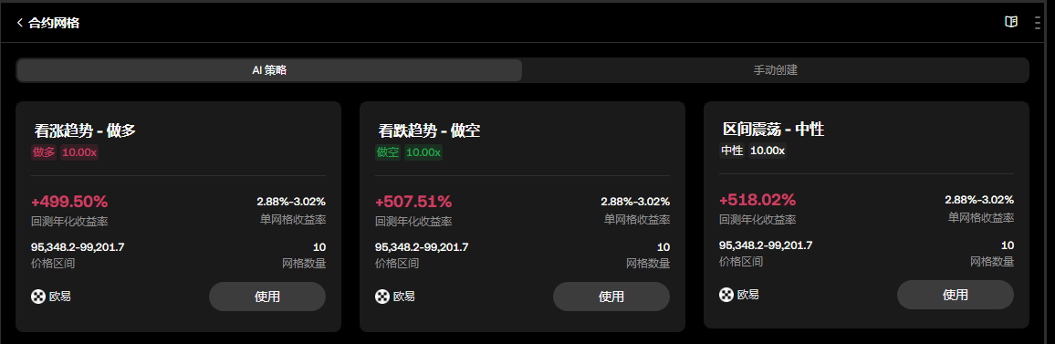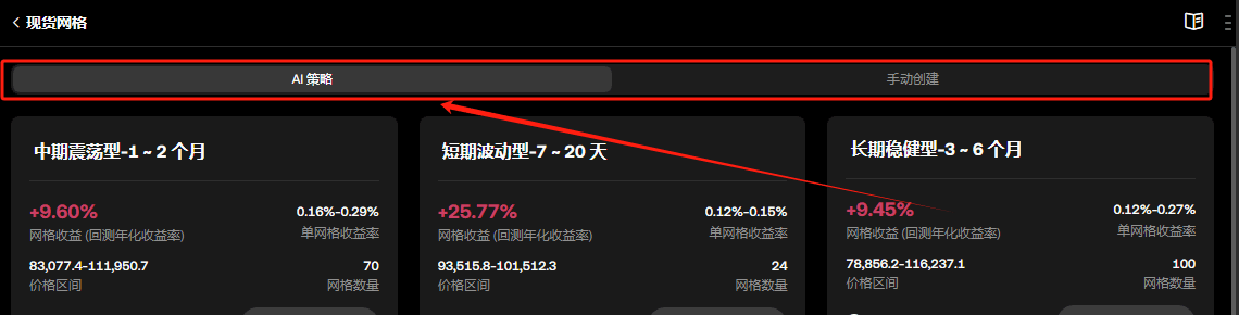 - **智能创建:**直接使用系统智能推荐的网格策略参数。(推荐参数的逻辑是:回测7日行情后,结合智能算法来推荐适合近期行情的参数)