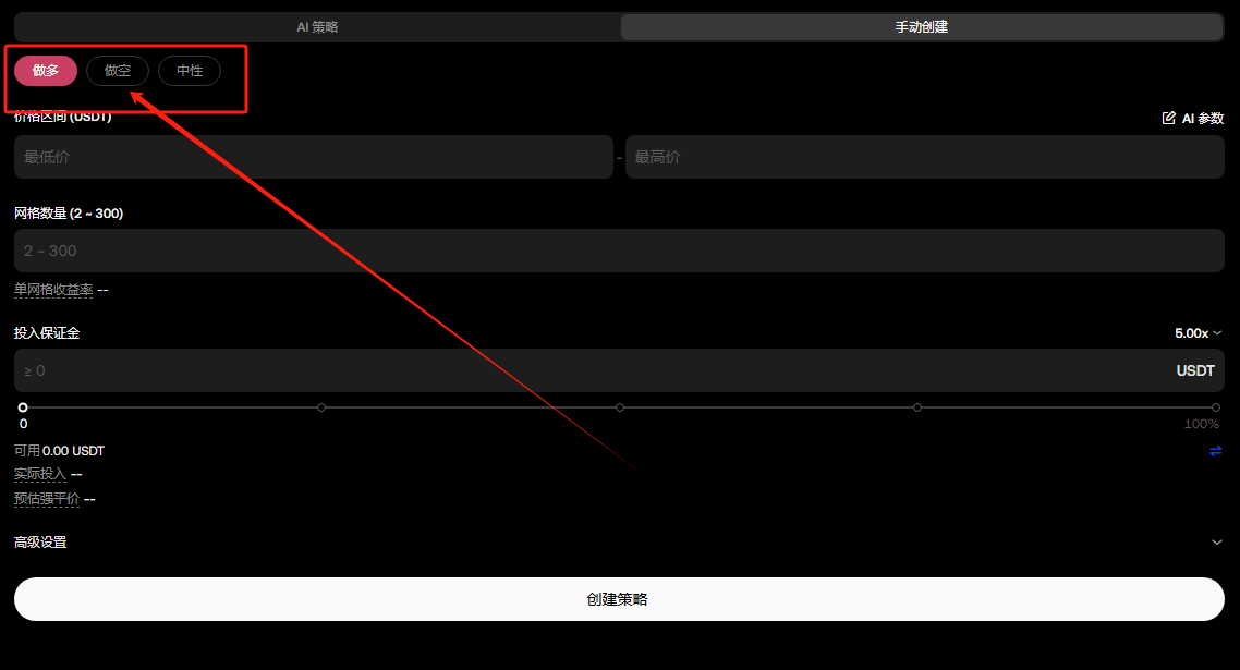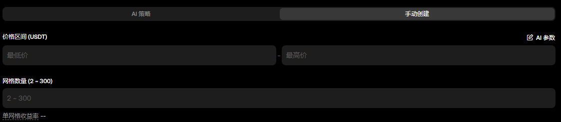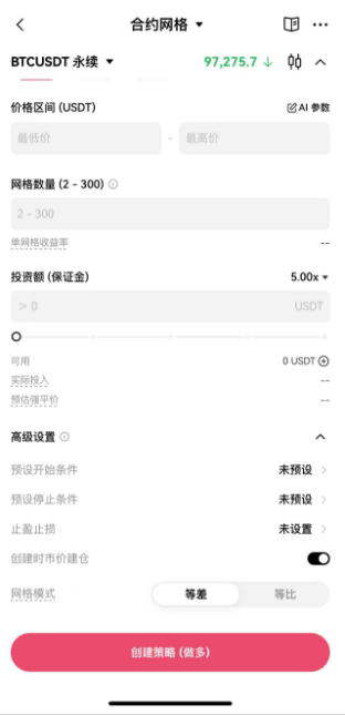- (2)在交易页面中输入参数或者使用智能参数,然后确认投资金额,即可创建网格。(网格创建后投入的资金会从交易账户中隔离出去,独立在网格策略中使用)