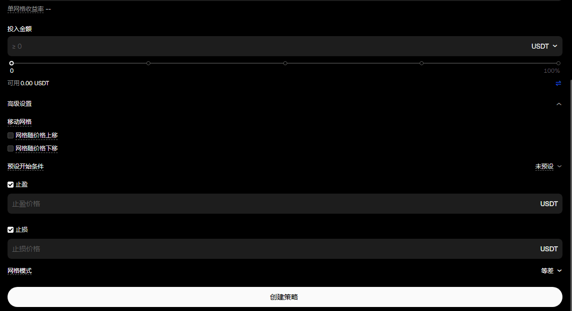 - 投入金额:在网格策略中投入的每种货币的数量。其中,每个币种的最大可用等于交易账户中目前该币种的最大可转出数量。