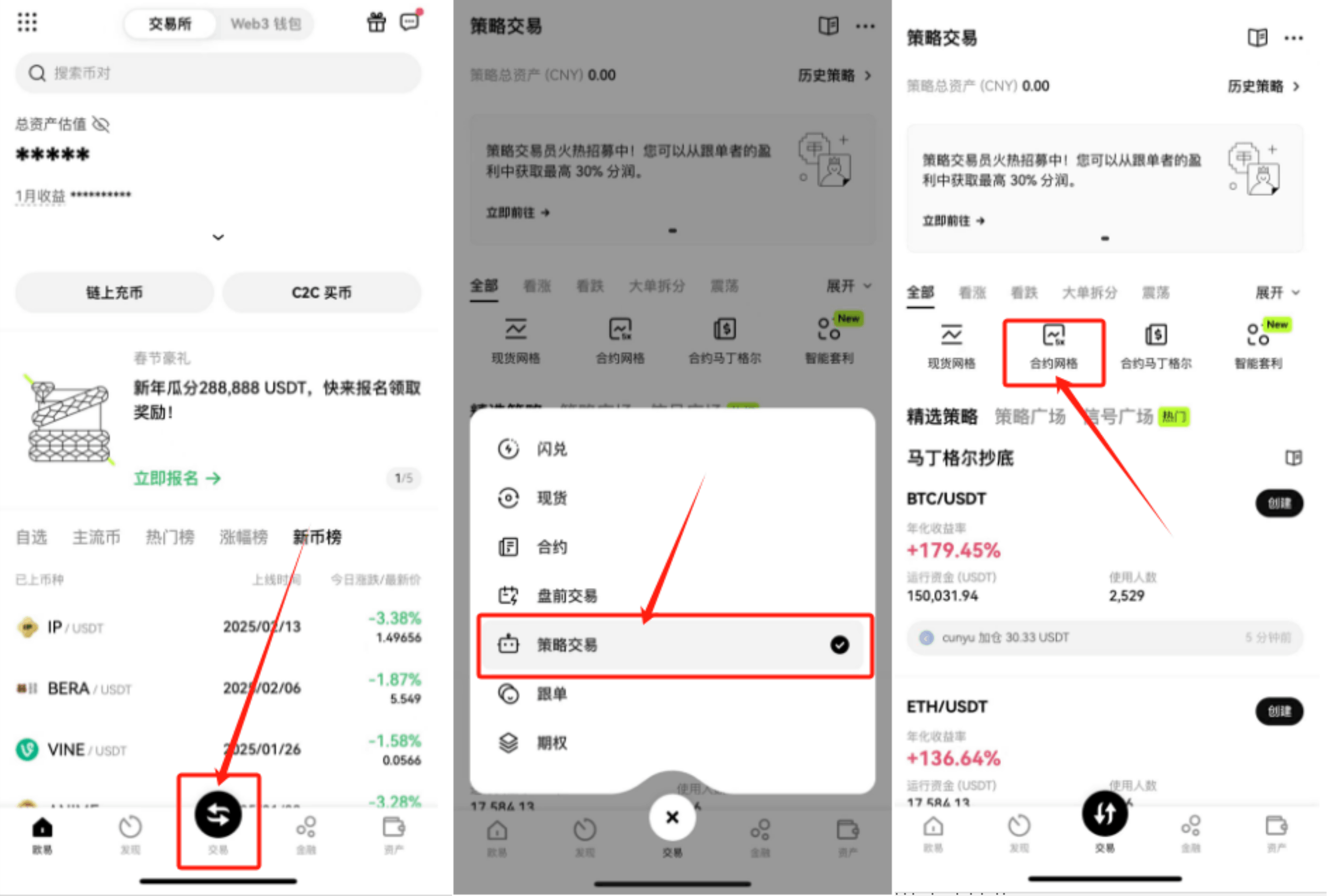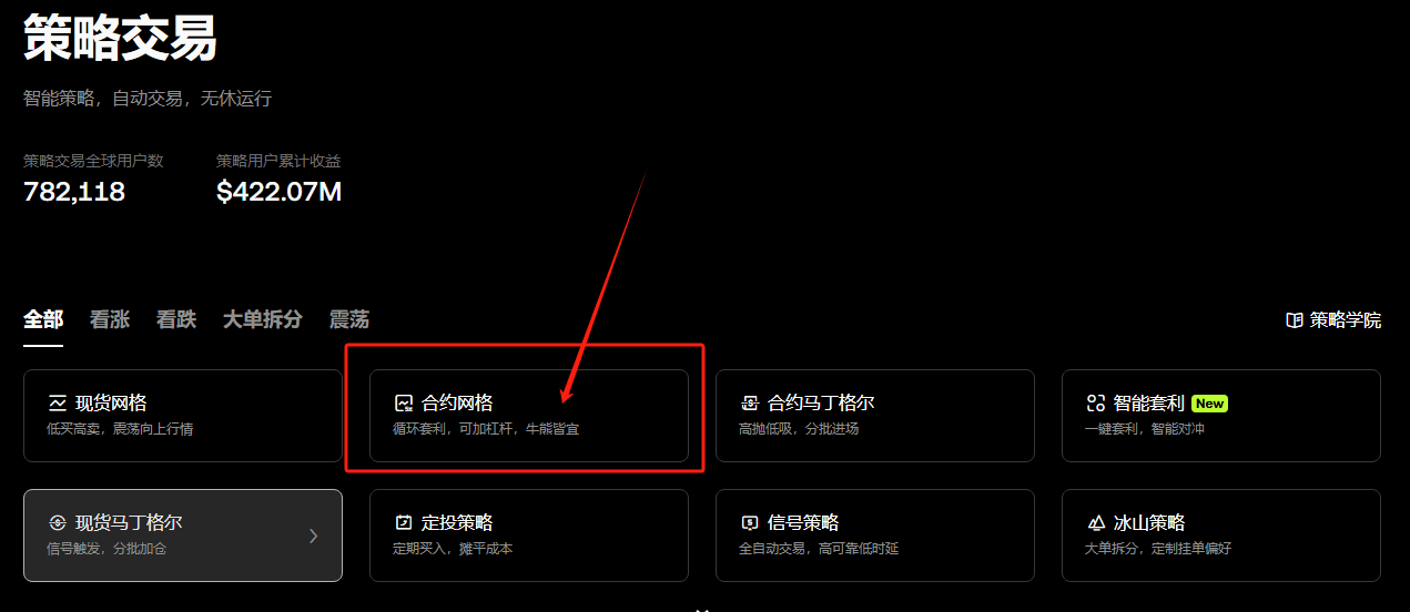 - (1)进入OKX的PC端或APP端之后,在"交易"页面中选择"策略交易模式"(PC端在左上角,APP端在右上角),然后选中合约网格。